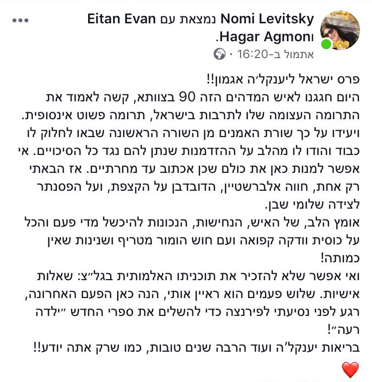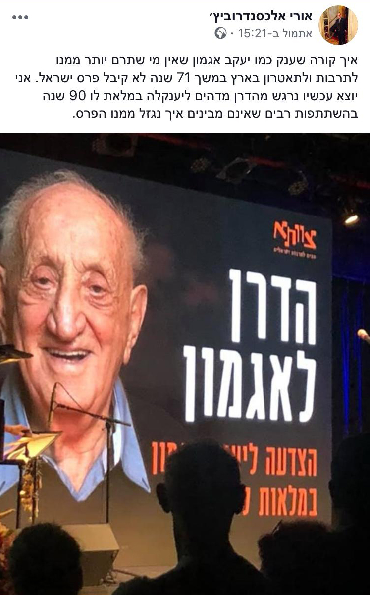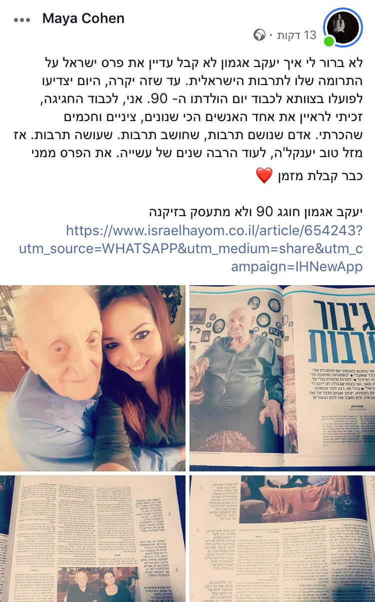 סיכום אירוע "הדרן ליעקב אגמון" במלאות לו 90 בפייסבוק של הגר אגמון >>