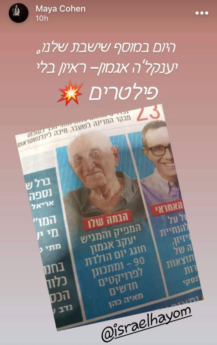 ברכת הגר אגמון לאביה יעקב אגמון באירוע אירוע "הדרן ליעקב אגמון" במלאות לו 90 בפייסבוק של הגר אגמון >>