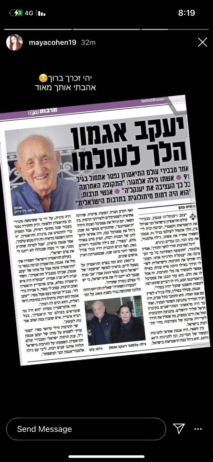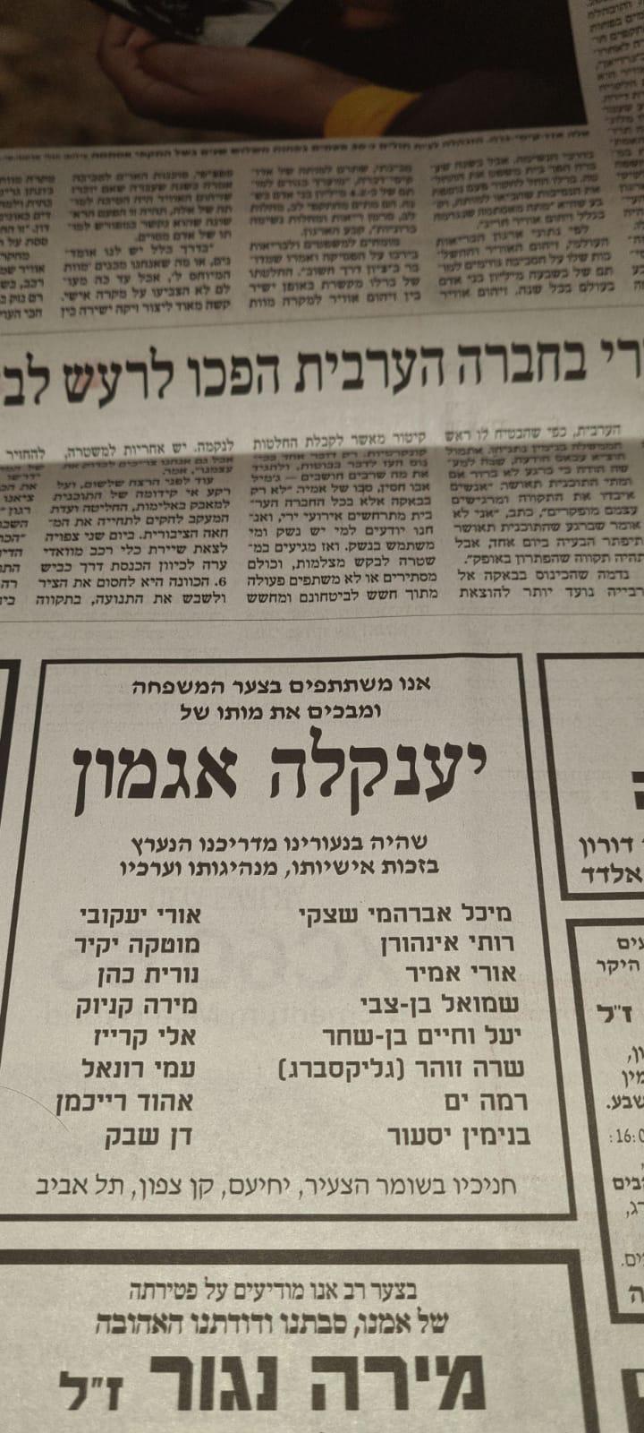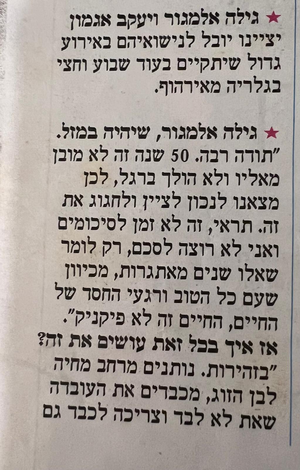 "הוא זעק שקוברים את התרבות, ועכשיו נגמר": גילה אלמגור נפרדה מבעלה יעקב אגמון, ליאור סורוקה, הארץ, 16.12.2020
